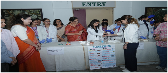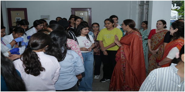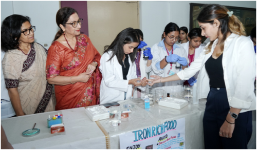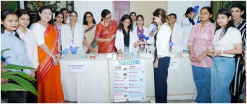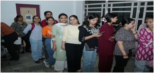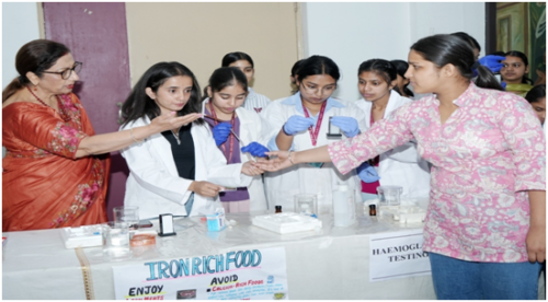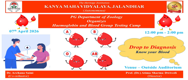 P.G. Department of Zoology at Kanya Maha Vidyalaya organized Hemoglobin and Blood Group Testing Camp to commemorate World Health Day on 7th April 2026. This initiative aligns with the global 2026 theme “Together for Health, Stand with Science”. The camp was primarily organized for college students and staff members to promote health consciousness and early detection of nutritional deficiencies. Students of B.Sc. (Medical Laboratory Technology) determined the blood group and assessed hemoglobin levels of 120 participants using sterile and hygienic techniques. Many participants were able to learn their blood group for the first time, while several cases of low hemoglobin were identified. They were educated about anemia prevention, balanced diet and importance of regular medical check ups. Professor (Dr.) Atima Sharma Dwivedi, Director, KMV Jalandhar emphasized that such camps should be organized regularly on campus to foster social responsibility and ensuring the well being of youth. She appreciated contribution of students and applauded the P.G. Department of Zoology for organizing the camp.