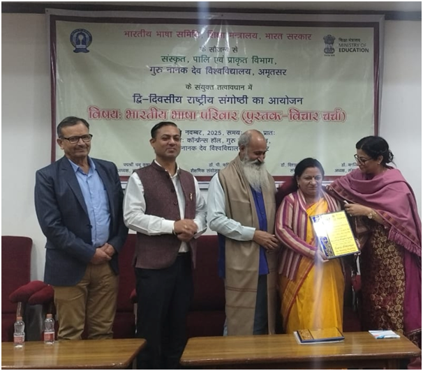 DR ( Mrs) Neeraj Sharma, Associate Professor and Head, Department of Sanskrit received the” GUEST OF HONOUR AWARD “ in the National Conference on organised by Department of Sanskrit, Guru Nanak Dev University, Amritsar. Collaboration with Bhartiya Bhasha Samiti, Ministry of Education, Government of India. New Delhi on 26th to 27th November, 2025.