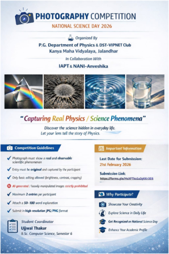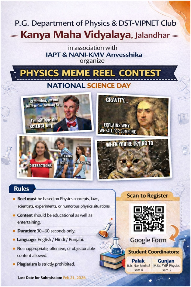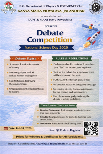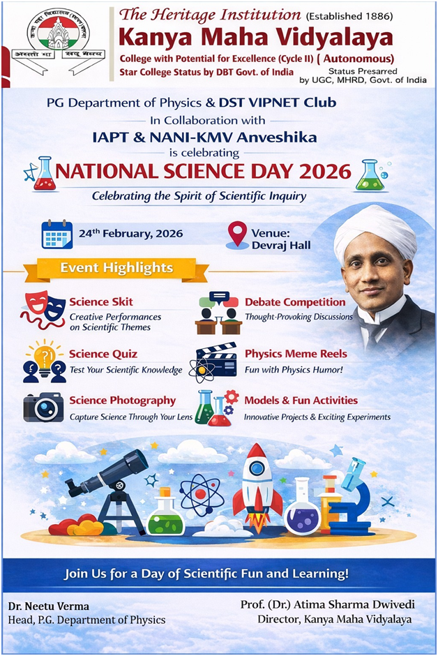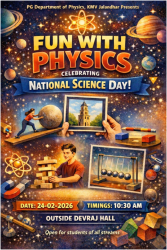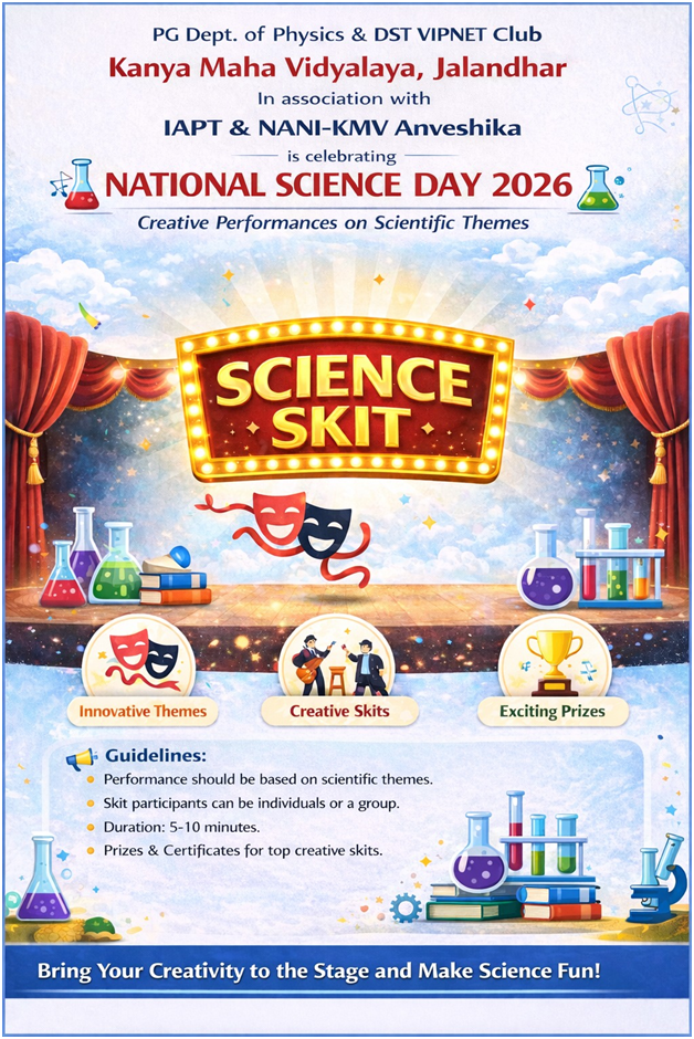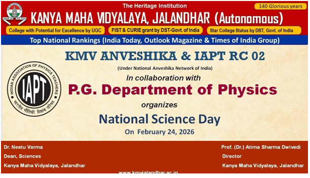 The P.G. Department of Physics at Kanya Maha Vidyalaya, Jalandhar, an Autonomous and Heritage Institution, celebrated National Science Day with an inspiring display of innovation, creativity, and intellectual fervor, in honor of the legendary C.V. Raman, whose groundbreaking work in Physics continues to inspire generations. The day was marked by a series of captivating events that paid homage to the immense contributions of science to society, with a special focus on the field of Physics.