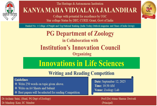 PG Department of Zoology, in collaboration with the Institution’s Innovation Council at Kanya Maha Vidyalaya, Jalandhar, organized a Writing and Reading Competition on the theme “Innovations in Life Sciences” on September 12, 2025, at10:30 AM in the Zoology Laboratory. This event aimed to foster scientific creativity and effective communication skills among students by encouraging them to explore innovative ideas and advances in the field of life sciences.