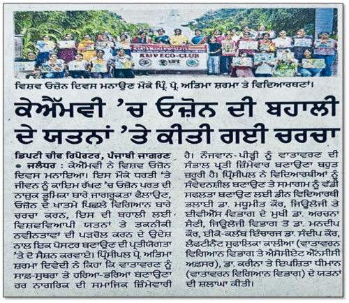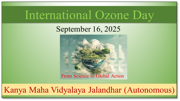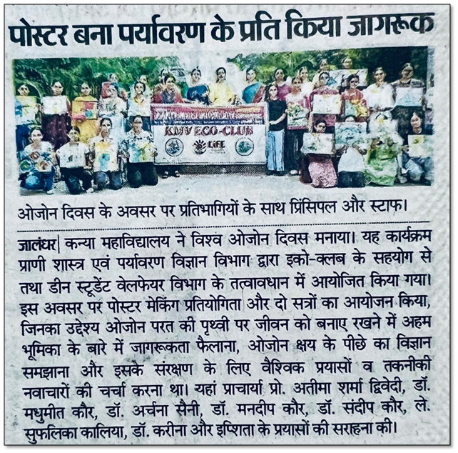 The Autonomous and Heritage institution, Kanya Maha Vidyalaya ranked No. 1 college of Punjab and Top National Ranking by India, Outlook Magazine and Times of India Group 2022 in order to spread awareness about the World Ozone Day. The event was organized by Department of Zoology &Environmental Sciences in collaboration with Eco-Club. Every year college grabs opportunity to sensitize students and institutional faculty regarding this vital environmental issue. Organized Poster making and two sessions aimed to spread awareness about the critical role of the ozone layer in sustaining life on earth, to discuss the science behind ozone depletion and to explore global efforts and technological innovations for its recovery and second session was an enlightening and thought-provoking session that enhance scientific awareness and inspired the audience to contribute towards protecting our atmosphere. Making competitions on 16th September, 2025 to celebrate “WORLD OZONE DAY” with theme: “FROM SCIENCE TO GLOBAL ACTION”. Around 50 students participated with full zeal and enthusiasm in the event to showcase their creativity. Principal Prof. (Dr.) Atima Sharma Dwivedi Congratulated the students and Dean Student welfare Dr. Madhumeet Kaur, Dr. Archana Saini head of Zoology and EVS department, Dr. Mandeep Kaur from department of Zoology, Dr. Sandeep Kaur incharge Eco -club, Lt. Sufalica Kalia Department of Environment Science & Associate NCC Officer, Dr. Karina & Ms. Ipshita Dhiman Department of Environment Science for sensitizing the students and making the event big success. She thanked all the students for joining the cause and asked them to connect to such initiatives in future too.