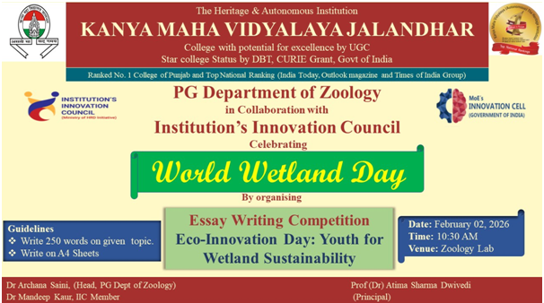 The PG Department of Zoology, in collaboration with the Institution’s Innovation Council at Kanya Maha Vidyalaya, Jalandhar, organized an essay writing competition on the occasion of World Wetlands Day on February 2, 2026, at 10:30 AM in the Zoology Laboratory. The theme of the competition, “Eco-Innovation Day: Youth for Wetland Sustainability,” highlighted the crucial role of young minds in promoting innovative solutions for wetland conservation and sustainable management.The event witnessed enthusiastic participation from undergraduate and postgraduate students who expressed their ideas on ecological restoration, biodiversity conservation, climate resilience, and community engagement. Participants emphasized the importance of wetlands in maintaining ecological balance and suggested creative, technology-driven approaches for their protection.
