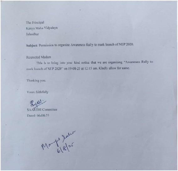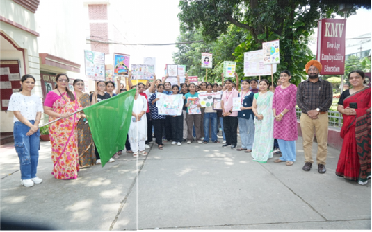 A rally was organized on August 19, 2025 by SAARTHI Committee at Heritage Institution Kanya Maha Vidyalaya (Autonomous), Jalandhar. Aim of rally was to raise awareness about the National Education Policy (NEP) 2020 and to inform students and the general public about the key reforms and transformative vision of the policy. The rally was flagged off by Principal Prof. Dr. Atima Sharma Dwivedi, who addressed around 50 participants and emphasized the significance of NEP in shaping a progressive, inclusive, and skill-oriented education system in India. She highlighted how the NEP empowers students with holistic and multidisciplinary learning opportunities. Students actively participated in the rally, carrying placards and raising slogans promoting the core values of the NEP, such as flexibility in learning, emphasis on mother tongue, and integration of vocational education. The rally passed through prominent areas around the campus and successfully garnered attention and appreciation from the local community. It served as an important step in promoting awareness and understanding of the policy among the youth. Atima Sharma Dwivedi, Principal KMV, College appreciated the contribution of the students and congratulated co-ordinators Dr. Madhumeet, co-coordinators Dr. Iqbal Singh, Dr. Monika Rani, Dr. Prabha and students for the event.
