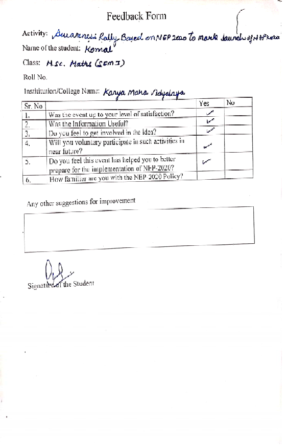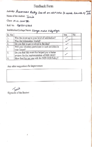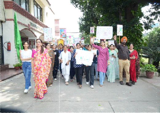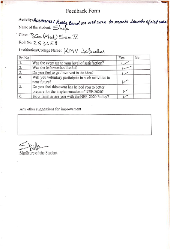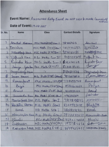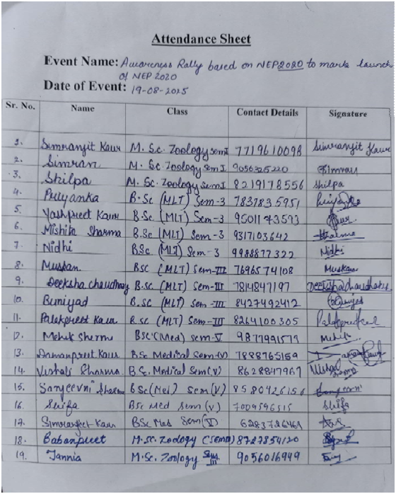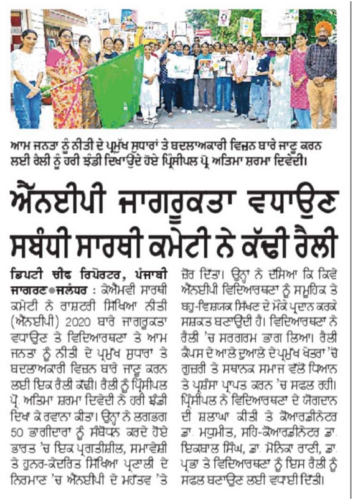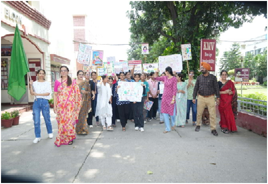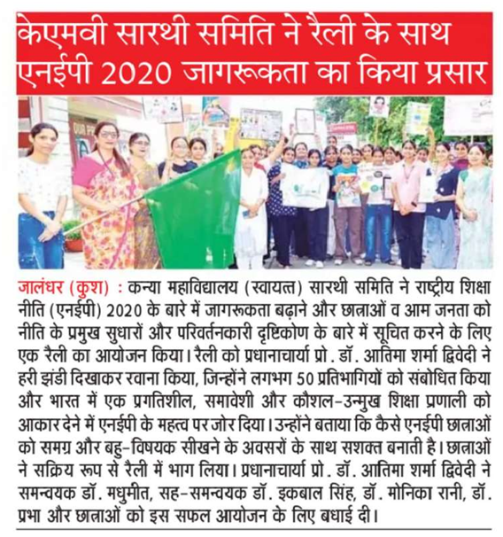 A rally was organized on August 19, 2025 by SAARTHI Committee at Heritage Institution Kanya Maha Vidyalaya (Autonomous), Jalandhar. Aim of rally was to raise awareness about the National Education Policy (NEP) 2020 and to inform students and the general public about the key reforms and transformative vision of the policy. The rally was flagged off by Principal Prof. Dr. Atima Sharma Dwivedi, who addressed around 50 participants and emphasized the significance of NEP in shaping a progressive, inclusive, and skill-oriented education system in India. She highlighted how the NEP empowers students with holistic and multidisciplinary learning opportunities. Students actively participated in the rally, carrying placards and raising slogans promoting the core values of the NEP, such as flexibility in learning, emphasis on mother tongue, and integration of vocational education. The rally passed through prominent areas around the campus and successfully garnered attention and appreciation from the local community. It served as an important step in promoting awareness and understanding of the policy among the youth. Atima Sharma Dwivedi, Principal KMV, College appreciated the contribution of the students and congratulated co-ordinators Dr. Madhumeet, co-coordinators Dr. Iqbal Singh, Dr. Monika Rani, Dr. Prabha and students for the event.