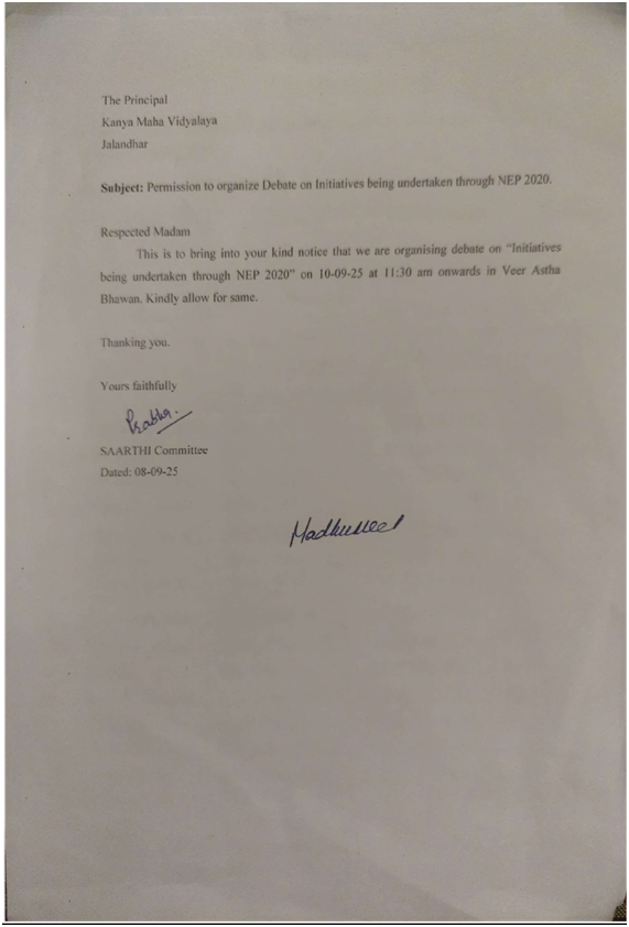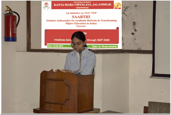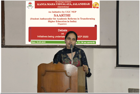Kanya Maha Vidyalaya (KMV), Jalandhar, organized a thought-provoking debate competition on 10th September 2025 centered around the theme “Initiatives under the National Education Policy (NEP)” as part of its continued commitment to academic excellence and holistic student development. The event witnessed enthusiastic participation from students across various departments, who eloquently presented their views both in favor of and against the various reforms introduced by NEP 2020. The competition provided a dynamic platform for students to critically analyze the policy’s potential impact on the Indian education system, including multidisciplinary learning, skill development, digital inclusion, and language promotion. Presiding over the event, Principal Prof. Dr. Atima Sharma Dwivedi commended the participants for their confident expression, in-depth research, and clarity of thought. She emphasized the importance of such intellectual forums in fostering a culture of awareness and analytical thinking among youth. Dr. Dwivedi also appreciated the relevance of the topic, stating that understanding and discussing NEP initiatives is essential for shaping future-ready individuals. The judges lauded the quality of arguments and the spirit of healthy competition displayed by the students. Winners were awarded certificates and trophies in recognition of their outstanding performances. The event concluded with a vote of thanks and a renewed commitment from KMV to keep empowering students through such engaging academic activities.