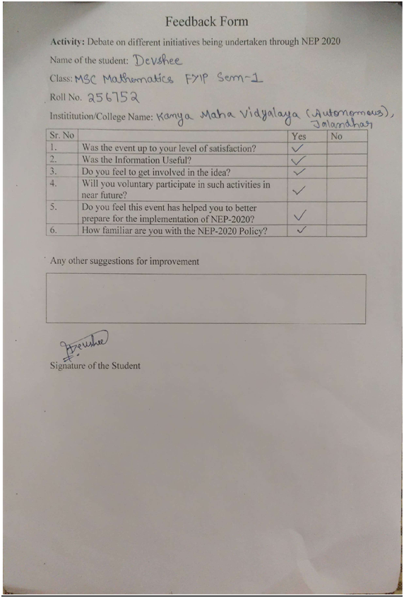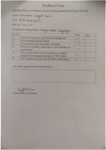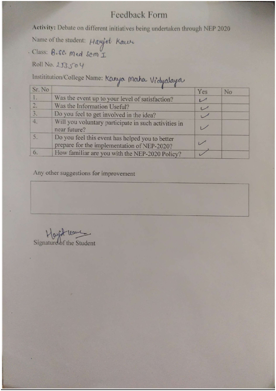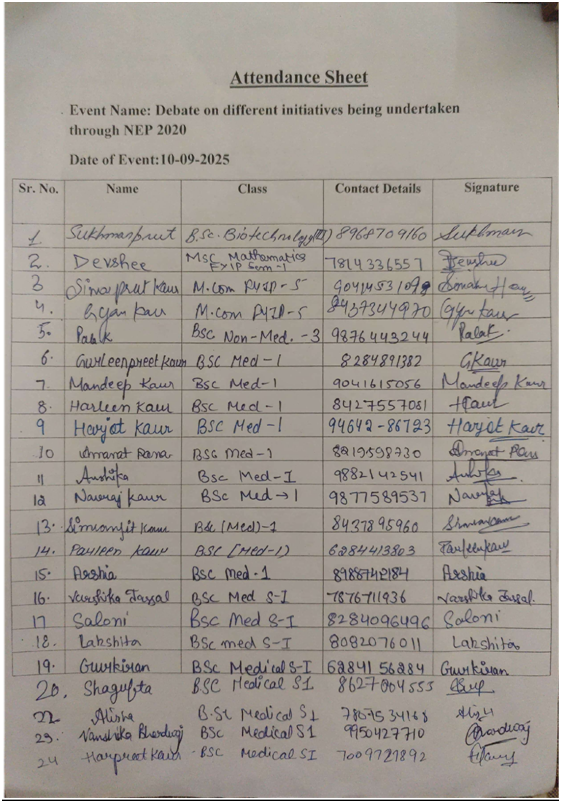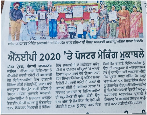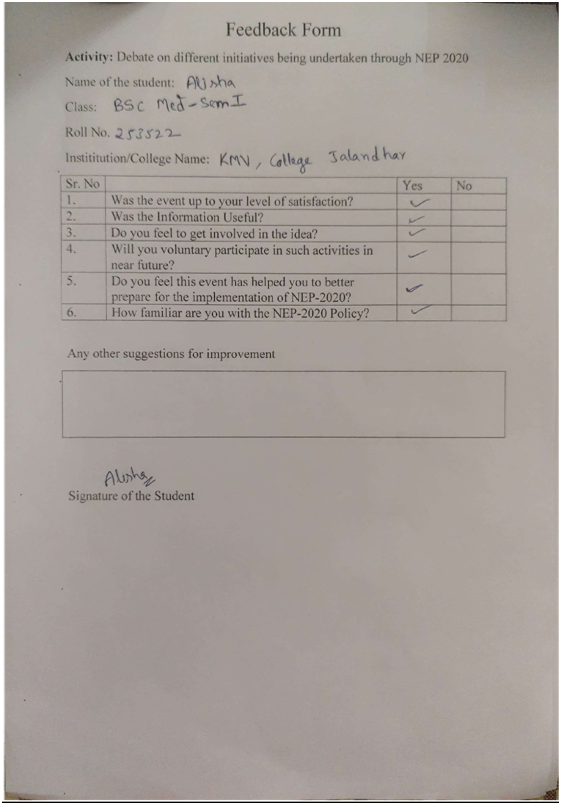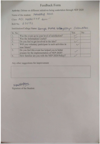 Kanya Maha Vidyalaya (KMV), Jalandhar, organized a thought-provoking debate competition on 10th September 2025 centered around the theme “Initiatives under the National Education Policy (NEP)” as part of its continued commitment to academic excellence and holistic student development. The event witnessed enthusiastic participation from students across various departments, who eloquently presented their views both in favor of and against the various reforms introduced by NEP 2020. The competition provided a dynamic platform for students to critically analyze the policy’s potential impact on the Indian education system, including multidisciplinary learning, skill development, digital inclusion, and language promotion. Presiding over the event, Principal Prof. Dr. Atima Sharma Dwivedi commended the participants for their confident expression, in-depth research, and clarity of thought. She emphasized the importance of such intellectual forums in fostering a culture of awareness and analytical thinking among youth. Dr. Dwivedi also appreciated the relevance of the topic, stating that understanding and discussing NEP initiatives is essential for shaping future-ready individuals. The judges lauded the quality of arguments and the spirit of healthy competition displayed by the students. Winners were awarded certificates and trophies in recognition of their outstanding performances. The event concluded with a vote of thanks and a renewed commitment from KMV to keep empowering students through such engaging academic activities.