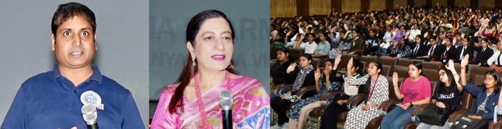 Kanya Maha Vidyalaya (Autonomous) PG Department of Mathematics celebrated the International Day of Mathematics by organizing a variety of activities as part of this major event. Some of the key activities included an expert talk on “Mathematical Methods and Models in Traffic Flow,” a Mathematical Rangoli Competition, and an Eminent Mathematician’s Sketch-Making Competition.Over50students participated in these events, showcasing their mathematical interests and talents. The expert talk was delivered by Dr. Arvind Kumar Gupta, Associate Professor at the Indian Institute of Technology, Ropar. Principal Prof. (Dr.) Atima Sharma Dwivedi extended a warm welcome to Dr. Gupta. During his session, Dr. Gupta focused on the application of Cellular Automata in traffic flow modeling, captivating students with his detailed explanation of the mathematical challenges and problem formulations involved. He discussed the various rules of Cellular Automata, particularly in its applications to physical and biological problems. The students were highly engaged during the session, posing insightful questions about open mathematical problems, problem-solving techniques, the significance of Pi, and its practical applications. The session had a significant impact, helping students gain a deeper understanding of the fascinating world of mathematics and its real-world relevance. The event also featured presentations on recent updates to the mathematics syllabus, aligned with the latest trends and advancements in the field. Students highlighted career opportunities and prospects in mathematics after completing their degree at KMV by Mathematical Modeling. Additionally, the students performed a Nukad Natak and a mathematical play, emphasizing how mathematics is omnipresent in daily life. Principal Prof. (Dr.) Atima Sharma Dwivedi lauded the efforts of Mrs. Veena Deepak, Head, PG Department of Mathematics and the entire faculty for their efforts in successfully organizing the event, which underscores the significance of mathematics in everyday life.