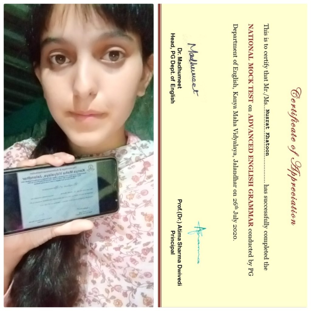 Kanya Maha Vidyalaya- the Heritage & Autonomous institution, Ranked No 1 by India Today Ranking 2020 being an educational institution par excellenceresponds to all challenges with an exceptional brilliance. In the wake of alarming situation prevailing in the world due to COVID-19, we have on no account let the interests of the students suffer. In order to harness the energies of the students in creative domains, the PG Department of English organiseda National Mock Test on Advanced English Grammar. Being a student friendly institution, KMV is planning to engage the students in student centric activities, so that they feel motivated. The online quiz was a feast for all those who have penchant for speaking and writing in English and wish to carve a niche for themselves in literary and other fields of life. The quiz has received an overwhelming response of more than 500 students from all over India. Participants scoring more than 60% marks have been awardedwith e- certificates &moreover, scholarships will be given to the top scoring students joining the KMV. Principal Prof Dr Atima Sharma Dwivedi averred that this type of quiz will help students reflect on their grammar skills and hone them for excelling in professional, academic and social activities in the English-speaking world. Madam Principal lauded the efforts of Dr Madhumeet, Head, PG Department of English &Dean, Department of Student Welfare for organising the online quiz very efficiently.