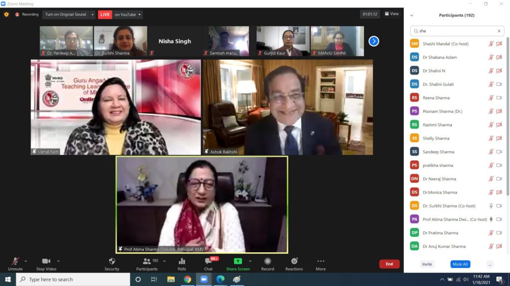 Kanya Maha Vidyalaya- the Heritage & Autonomous institution, Seat of Women Empowerment with Top National and State Rankings by India Today Survey of Best Colleges 2020 (various categories) & Outlook Magazine organised one week online national Faculty Development Program in collaboration with Guru Angad Dev- Teaching Learning Centre, SGTB Khalsa College, University of Delhi on Development of e-content & MOOCS in Four Quadrants sponsored by Department of Biotechnology, Government of India. More than 200 teachers from 18 states of India participated in this week long Faculty Development Program. The FDP was organised by the Department of Sciences under DBT Star Status. Dr AK Bakshi, Chairman,Guru Angad Dev- Teaching Learning Centre,SGTB Khalsa College, University of Delhi was the Chief Guest for the inaugural session. Dr Vimal Rarh, National Co-ordinator, Project Head & Joint Director,Guru Angad Dev- Teaching Learning Centre,SGTB Khalsa College, University of Delhi was also present. The inaugural ceremony commenced with the welcome address by Principal Prof Dr Atima Sharma Dwivedi. Prof Dwivedi welcomed all the esteemed guests and the participants. She averred thatthere is a need to transform the traditional class room teaching to digital teaching. A teacher should not only have the knowledge of her subject content but should also have good command on speech. To amalgamate teaching with interactive digital teaching technique is the need of hour and with the objective of empowering a teacher current FDP is being organized.The inaugural address was presented by Dr. Vimal Rarh, Project Head and Joint Director, Guru Angad Dev Teaching Learning Center of MHRD. In her address Dr. Vimal Rarh explained ways of generating e-content at national level. She also elaborated that for upgrading a teacher: faculty empowering workshops, preparation of teacher’s e-kit and multi media enriched videos should be developed. Development of ICT skills and pedagogy for virtual and online teaching is the need of hour, she said. Dr. Rarh divided Teacher’s e-kit into four quadrants viz. Teacher’s manual, Teachers video for flipped class room, teacher’s assignment and teacher’s know more.Prof Dr AK Bakshi in his keynote address gave a talk on Digital Transformation in Higher Education in India: Opportunities & Challenges. Dr Bakshi began his talk by complementing KMV for its progressive &outstanding contribution to the education field in India. He said that KMV is a role model institute for others to follow. The talk of Dr Bakshi was divided into four parts i.e. Digital Transformation and its needs, ICT empowered Pedagogy: Flipped Classroom Model, Integration of ICT and Future of Digital Transformation. Prof Bakshi stated that Digital Transformation helps in enhancing the quality of education & achieving goals of education. He further elaborated on the fact that education is the training of the mind and not learning the facts only. Education should motivate the students to think critically and instil logical reasoning in them. He stated that in India, a lot of emphasis is given on teaching, but not much on effective learning. He further stated that today’s age is of Artificial Learning, where it will equal the intelligence of the students, so it becomes imperative for the teachers to learn new skills and also impart it to their students. Elaborating on the role of technology in education, Prof Bakshi stated that Information & Communication Technology has impacted all areas of education in various forms. He said that MOOCs is a form of e- learning but in a very structured manner. Prof. Bakshi also acquainted all the participants about the SWAYAM portal of Government of India in which any teacher or student can access MOOCof any subject for digital learning.A virtual tour of KMV was also shown to all the participants during the session. Dr Neetu Chopra, Co-ordinator, DBT Star College Status gave Vote of Thanks to all the esteemed guests and participants. Madam Principal lauded the efforts of organising team for successfully organising the one week Faculty Development Workshop.