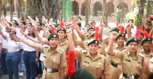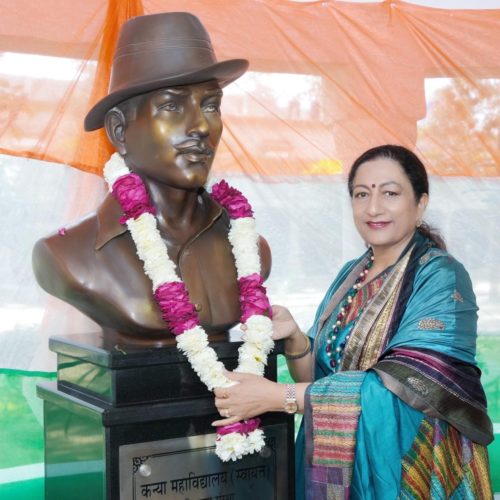 Kanya Maha Vidyalaya (Autonomous)paid a nostalgic tribute toShaheed-E-Azam Sardar Bhagat Singh on his Martyrdom Day at Shaheed Bhagat Singh Heritage Memorial situated in the college campus.Director Prof. (Dr.) Atima Sharma Dwivedialong with faculty members and students paid nostalgic tribute to the great martyr. Prof. Dwivediaverred that every time she thought of the sacrifices of the magnitude of Bhagat Singh, Rajguru and Sukhdev,she was indeed humbled. She exhorted one and all to idolize the martyr like Bhagat Singh and to carry forward the message of Bhagat Singh as this will be the true tribute to the national hero.She further maintained that it is a matter of great pride that KMV has a close connection with Bhagat Singh as he was very close to KMV’s then Principal Acharya Lajjawati ji and used to take shelter at KMV during the struggle for national freedom. As a mark of our tribute to Bhagat Singh and to cherish close connection and association with him, KMV has constructed a heritage memorial in the pristine surroundings of KMV hostel. KMV is a nationalistic institution which has played an active role in the freedom struggle as our students have been among the first women to join the freedom struggle.This premier institution of women empowerment has been held in great esteem by national leaders andhas been visited by a galaxy of national leaders including five presidents and five prime ministers of India. Madam lauded the efforts of the whole organizing committee for successfully organizing the celebrations.