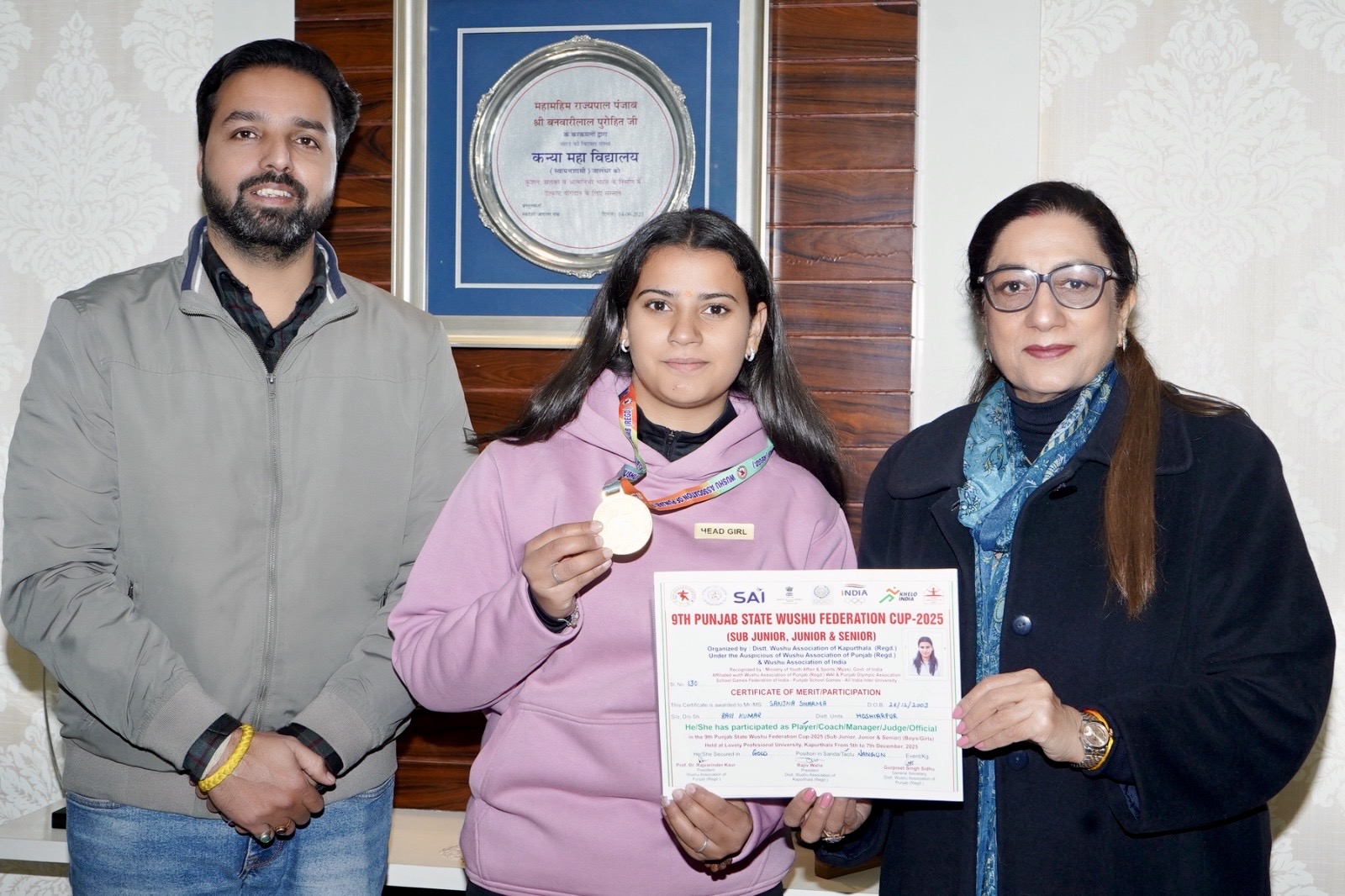 Kanya Maha Vidyalaya (Autonomous) student of BCA Semester V, Ms. Sanjna Sharma, showcased exceptional talent by winning the Gold Medal at the Punjab State Wushu Federation Cup–2025 (Senior Category). Her remarkable performance in this prestigious championship earned her recognition and paved the way for higher-level participation. Following her state-level success, Ms. Sanjna Sharma went on to represent Punjab State at the 9th Federation Cup Wushu Championship–2025, a national-level event. She competed in the Traditional Event, Senior Category – Taijiquan Types (Female), displaying commendable skill, discipline and sportsmanship. Her achievements reflect her unwavering dedication to martial arts and bring immense pride to the institution. Prof. Dr. Atima Sharma Dwivedi congratulated Ms. Sanjna Sharma for her remarkable accomplishments and extended their best wishes for her continued success in future competitions. The institution reiterated its commitment to nurturing holistic development by encouraging students to excel in academics, sports and co-curricular activities.