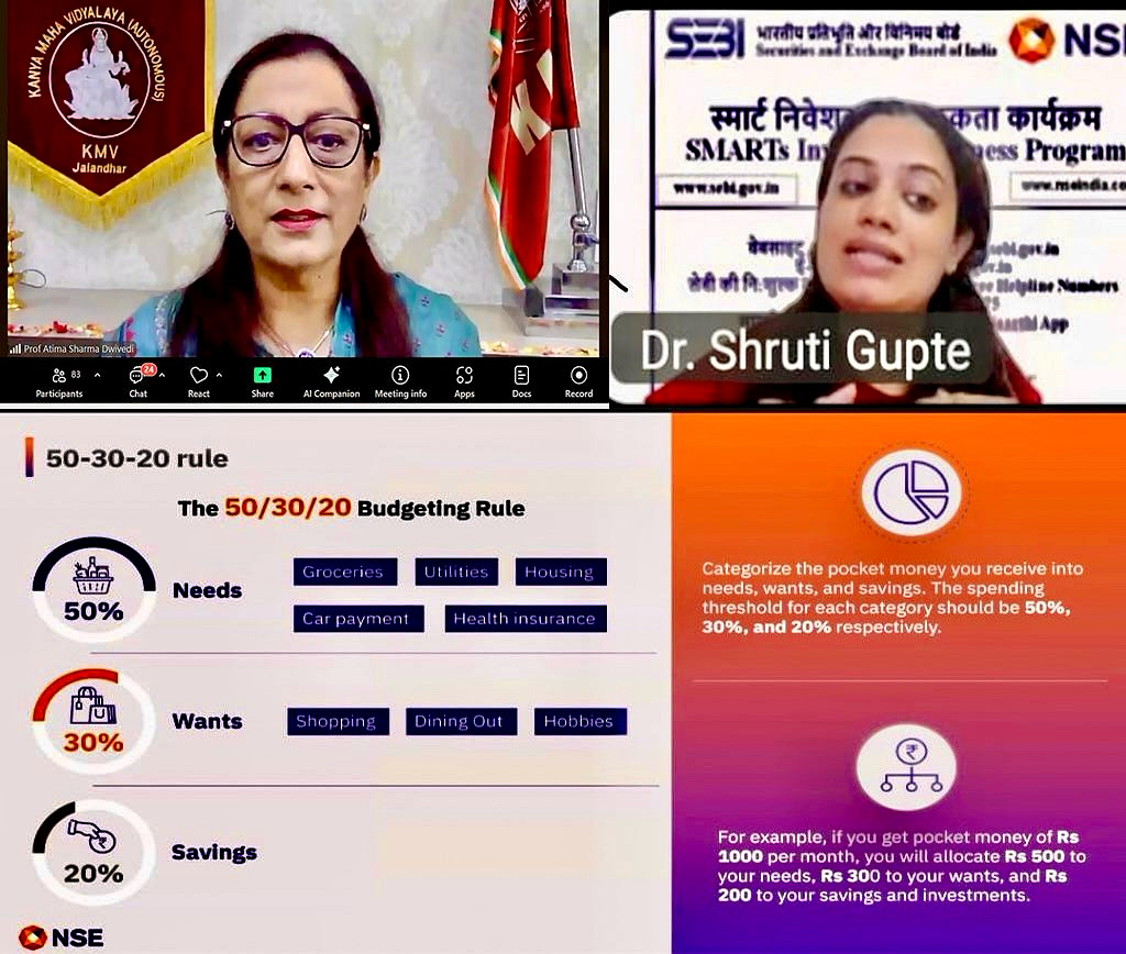 Kanya Maha Vidyalaya (Autonomous) has always been making efforts for the holistic development of the students. In keeping with this tradition, P.G. Department of Commerce and Business Administration in association with Securities Exchange Board of India (SEBI) organised a webinar on Financial Awareness and diversified Investment Portfolio. The resource person for the workshop was Ms. Shruti Gupte, an empaneled trainer with National Institute of Securities Market, Securities and Exchange Board of India. Ms. Shruti Gupte apprised the students about various topics like importance and various ways of saving money. She discussed about the 50-30-20 Budget Rule in detail. She also explained the impact of inflation on savings & gave an in depth knowledge regarding the concept of compound interest. She also acquainted the students with the risk and reward matrix. Ms. Shruti Gupte addressed the queries of all the participants very aptly. Principal Prof. Dr. Atima Sharma Dwivedi expressed her gratitude for the resource person and lauded the efforts of Dr. Neeraj Maini, Dr. Sabina Batra and faculty for taking initiatives to keep the students abreast of the latest developments in the field of Securities Market.