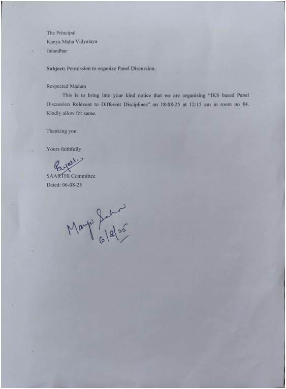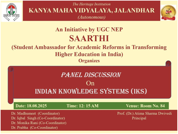 A thought-provoking Panel Discussion on Indian Knowledge Systems (IKS) was organized on August 18, 2025 by SAARTHI Committee at Heritage Institution Kanya Maha Vidyalaya (Autonomous), Jalandhar. Panel discussion was aimed at exploring the relevance and application of IKS across various academic disciplines. The event, held under the aegis of the college’s ongoing efforts to integrate traditional wisdom with contemporary education, witnessed enthusiastic participation from faculty, scholars, and students. The panel discussion brought together eminent academicians and experts from diverse fields including sciences, humanities, commerce, and social sciences, each offering insightful