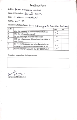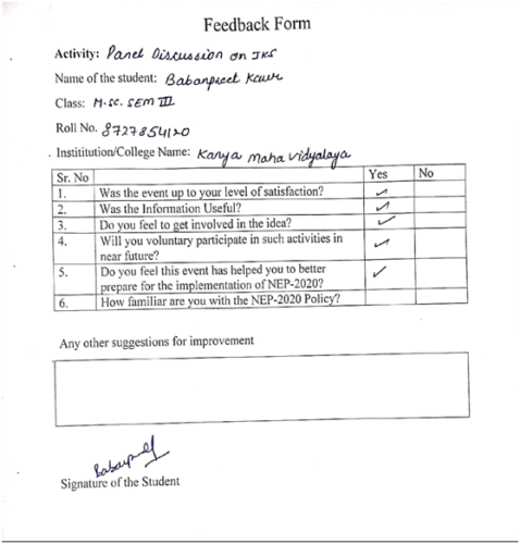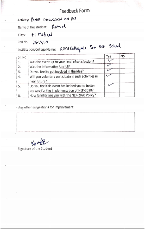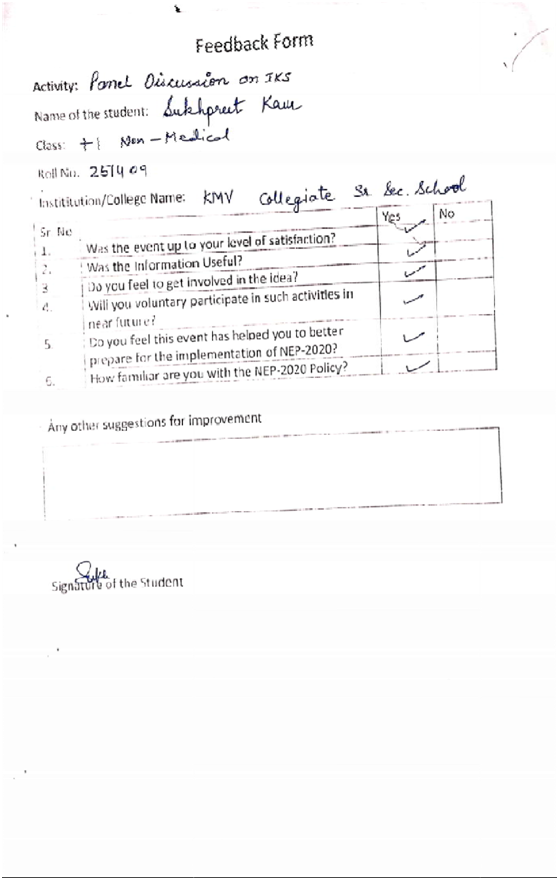 perspectives on how Indian Knowledge Systems can enrich and enhance modern academic curricula. The panel lists emphasized the holistic, interdisciplinary, and sustainable approaches embedded in IKS, highlighting its potential to address contemporary challenges in education, environment, ethics, and innovation. The Principal of KMV, Prof. Dr. Atima Sharma Dwivedi, in her inaugural address, emphasized the significance of Indian Knowledge Systems in building a self-reliant and culturally grounded academic framework. She highlighted KMV’s commitment to nurturing values, critical thinking, and a sense of rootedness among students through such initiatives. Students also participated in this discussion and talked on diverse topics including – scientific basis of traditional practices in Ayurveda and agriculture, literary and philosophical richness of ancient Indian texts, Mathematical and astronomical achievements in ancient India, Relevance of Indian ethics and values in modern management and commerce and Integration of IKS with NEP 2020 and its implications for interdisciplinary research. The session concluded with an engaging Question & Answer, where students posed thoughtful questions, reflecting their growing interest in IKS. The event was lauded for its intellectual depth, interdisciplinary approach, and its role in reviving interest in India’s rich academic heritage. Overall, the panel discussion was a significant step towards re-establishing the relevance of Indian Knowledge Systems in today’s educational landscape and strengthening the institution’s commitment to academic excellence rooted in cultural consciousness.