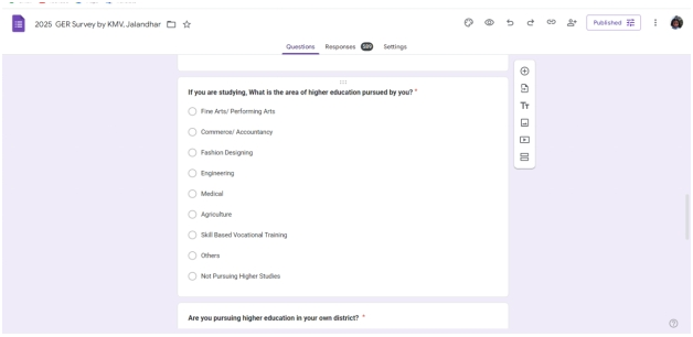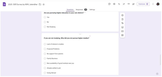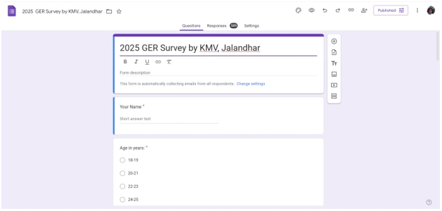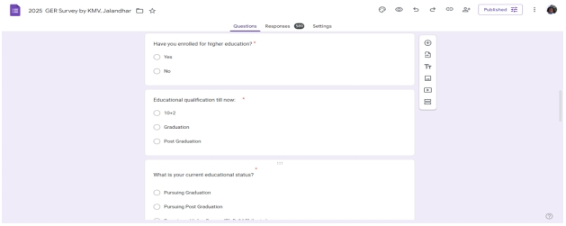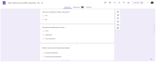 A survey to investigate the Gross Enrollment Ratio (GER) in the Jalandhar district was conducted by 108 Commerce Department students. GER, a key indicator of educational inclusion and accessibility, aligns with the NEP 2020 goal of increasing enrollment in higher education. The students aimed to understand educational trends and youth participation in higher education. Data was collected through questionnaires shared both online and offline, resulting in over 500 responses. The activity enhanced students’ research and analytical skills while offering insights into local educational challenges. Findings from the survey can support policy planning to improve GER. The initiative reflects a meaningful step toward achieving national education targets.